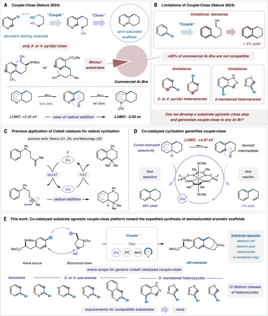 It builds on the couple-close paradigm introduced by the lab two years ago after debate about whether it was feasible to bring two simple fragments together and form a fused ring system in one pot. MacMillan researchers proved it was. Then they pursued the next step: a generalized approach for the synthesis of semisaturated cyclic scaffolds that uses cobalt catalysis as a way to, analogously, close off a loose end.